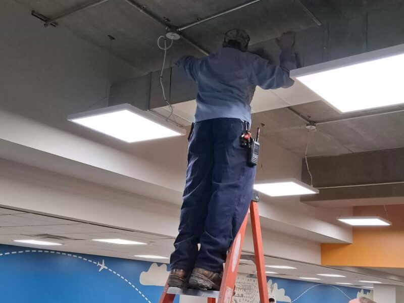 ACAA electricians used a ladder to retrieve Licorice the Lizard from a ceiling light fixture inside PIT’s new Kids Play Area. (ACAA photo)
