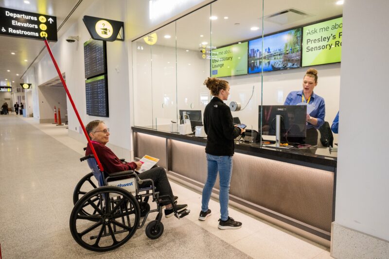Wheelchairs can be requested at the airline’s ticket counters on the Departures level in addition to when booking a flight. Passengers can also arrange for a wheelchair when at the airport by contacting the Information Desk.