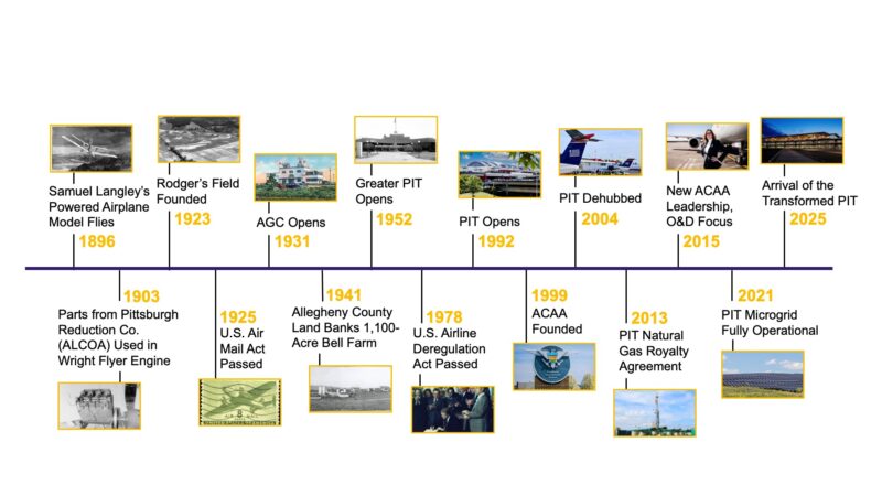 A timeline of major moments in Pittsburgh’s aviation history, from the region’s first airport to the transformed terminal’s Opening Day. (Graphic by Kim Medvid).