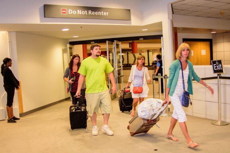 Arriving passengers entering the Welcome Point of the new terminal, a space specifically designed  for travelers to meet with their friends and family. (Photo by Beth Hollerich)