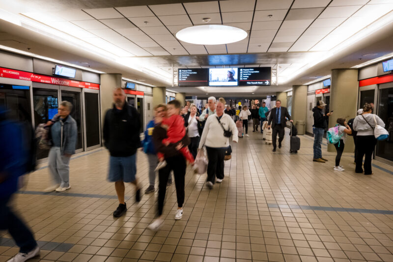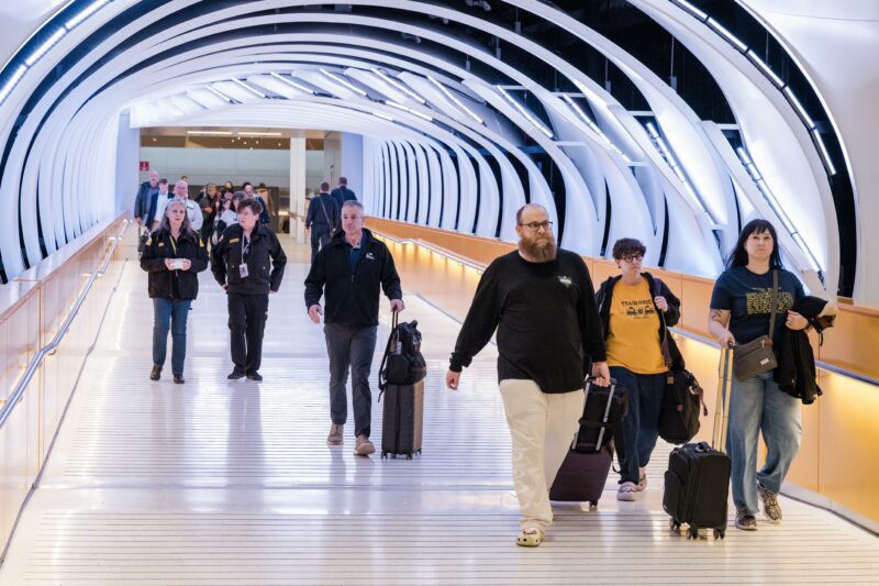Passengers transiting the Skybridge that connects the new terminal to the Core and all gates. (Photo by Beth Hollerich)