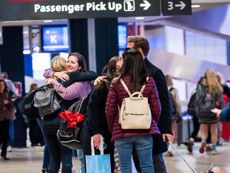 Passengers meeting with loved ones in the Landside Terminal baggage claim area. (Photo by Beth Hollerich)