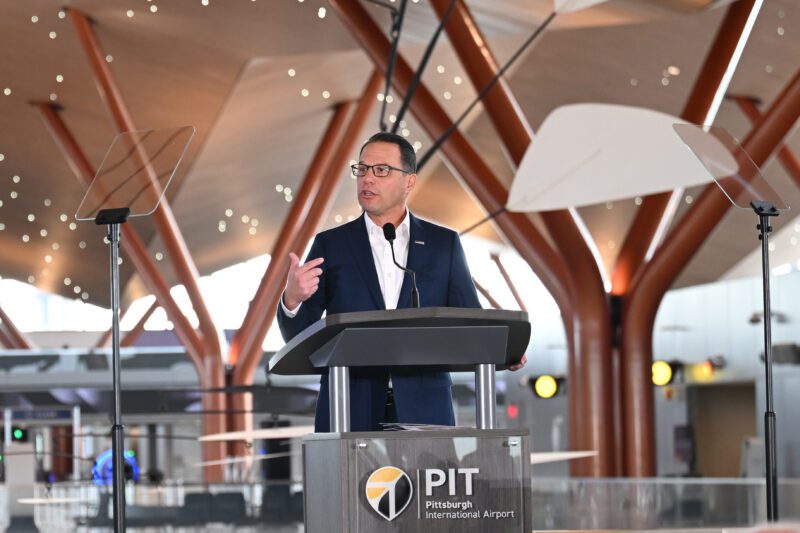 Pennsylvania Gov. Josh Shapiro gives remarks to audience members at the Ribbon Cutting Ceremony for PIT’s new terminal on Oct. 11, 2025. (Photo by Beth Hollerich)